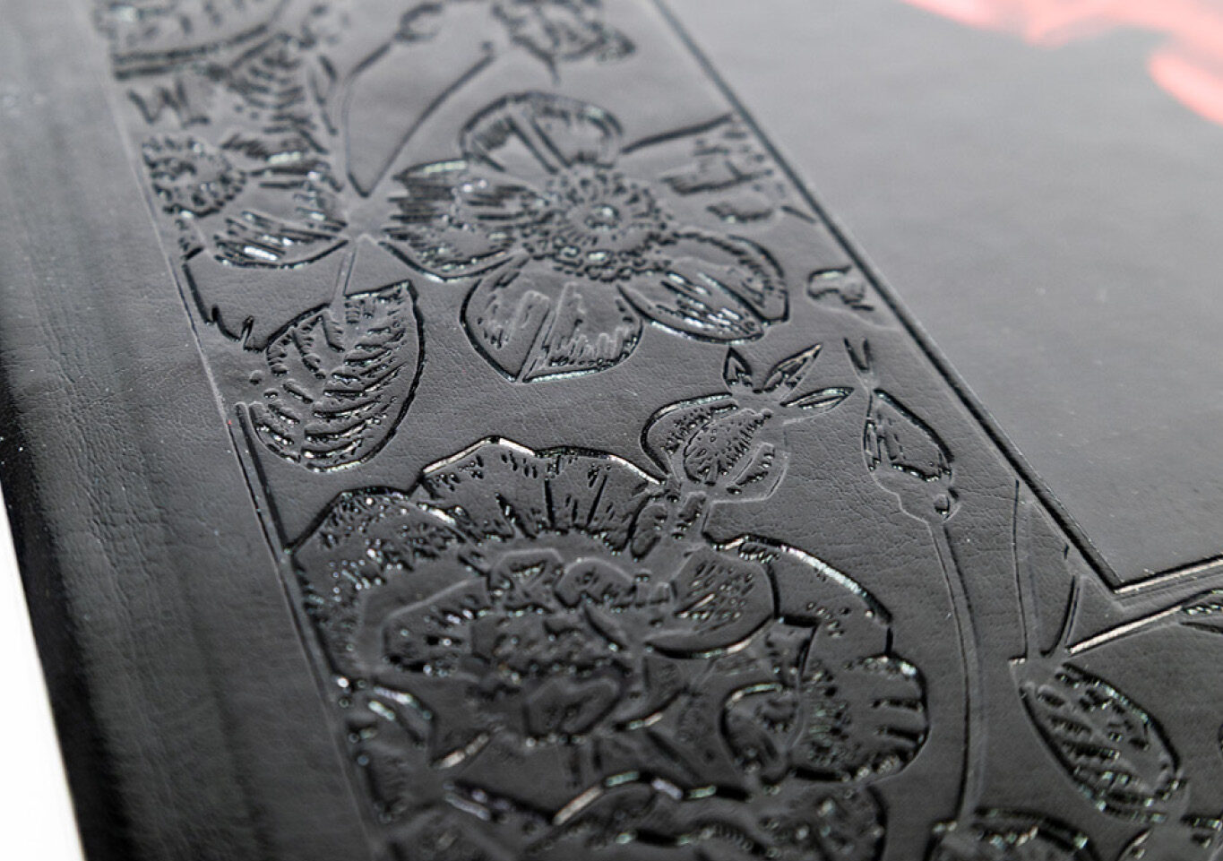 Le débossage est un procédé qui consiste à imprimer un motif sur la couverture ou la page d'un livre, créant ainsi une impression en creux. Il s'agit d'une matrice métallique personnalisée, estampée dans le matériau par pression. On l'utilise souvent avec de l'encre ou une feuille métallique pour un contraste accru.